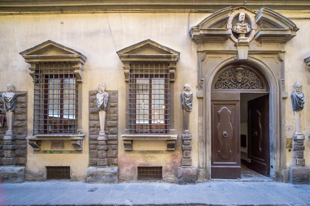 The current architecture, obtained by the reunification of several Medieval houses, was lend at the end of sixteenth century, when the cultured senator Baccio Valori il Giovane, new owner and custodian of Biblioteca Laurenziana, beside being president of Art and Drawing Academy, made the facade renewed by architect and sculptor Giovanni Battista Caccini (between 1593 and 1604), adorning it on the base of an iconographic program defined by himself: 15 herms depicting illustrious personalities, estimated in science and arts, who contributed to make Florence grow with their activities.
