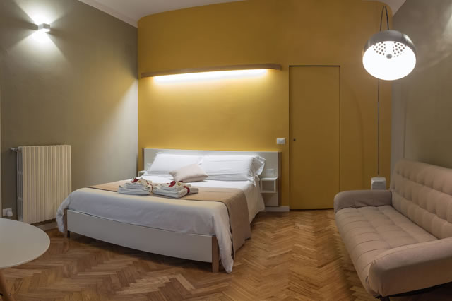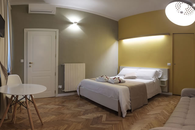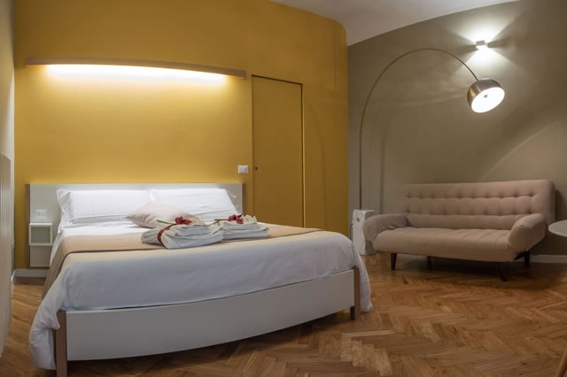 Family Deluxe Room, spacious and comfortable with contemporary design, with kitchenette, dining area, sofa bed in modern style, walk-in closet, parquet floor, double bed, private bathroom with large shower and complimentary toiletries. The room can accommodate up to a maximum of 2 people.